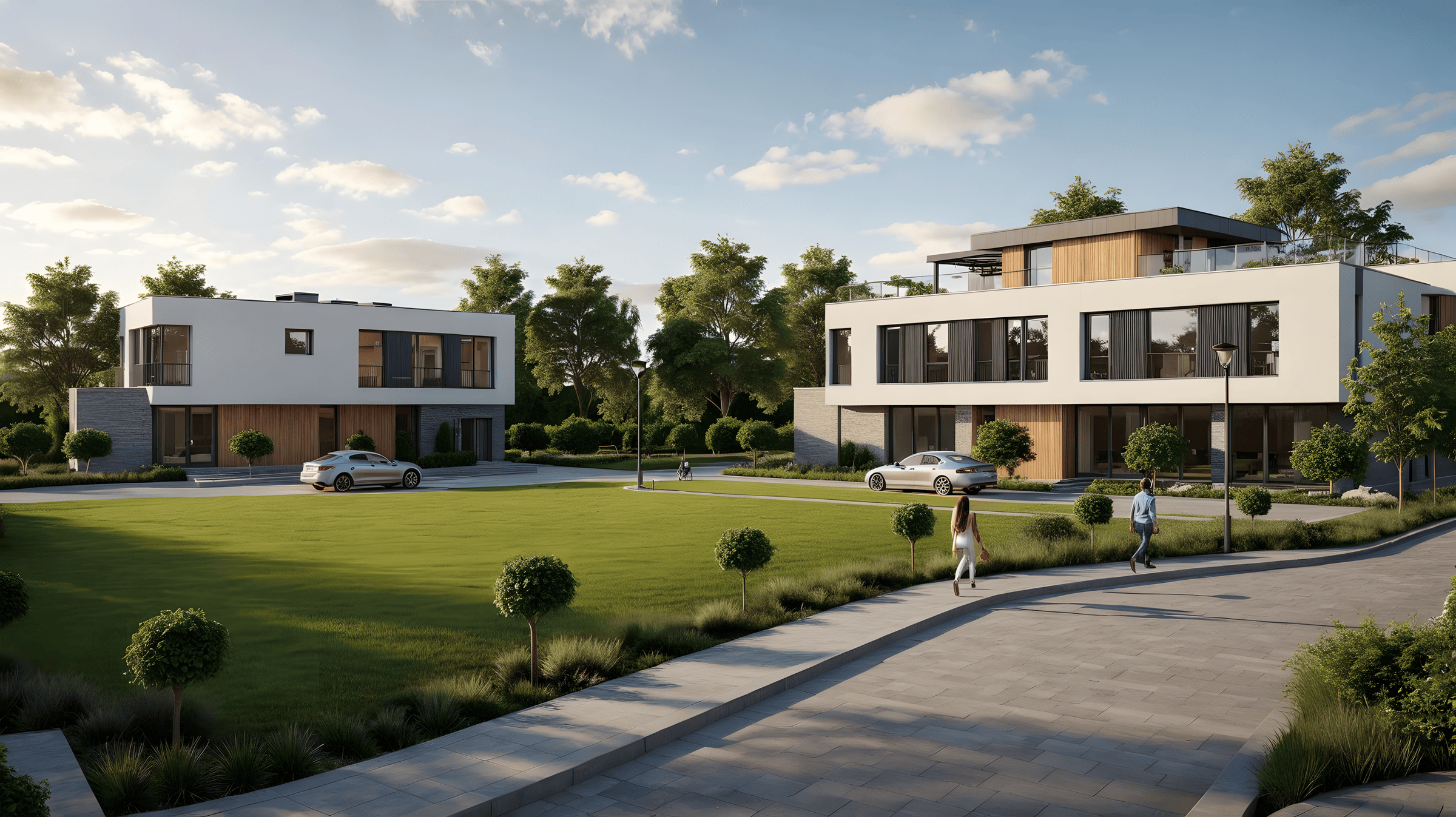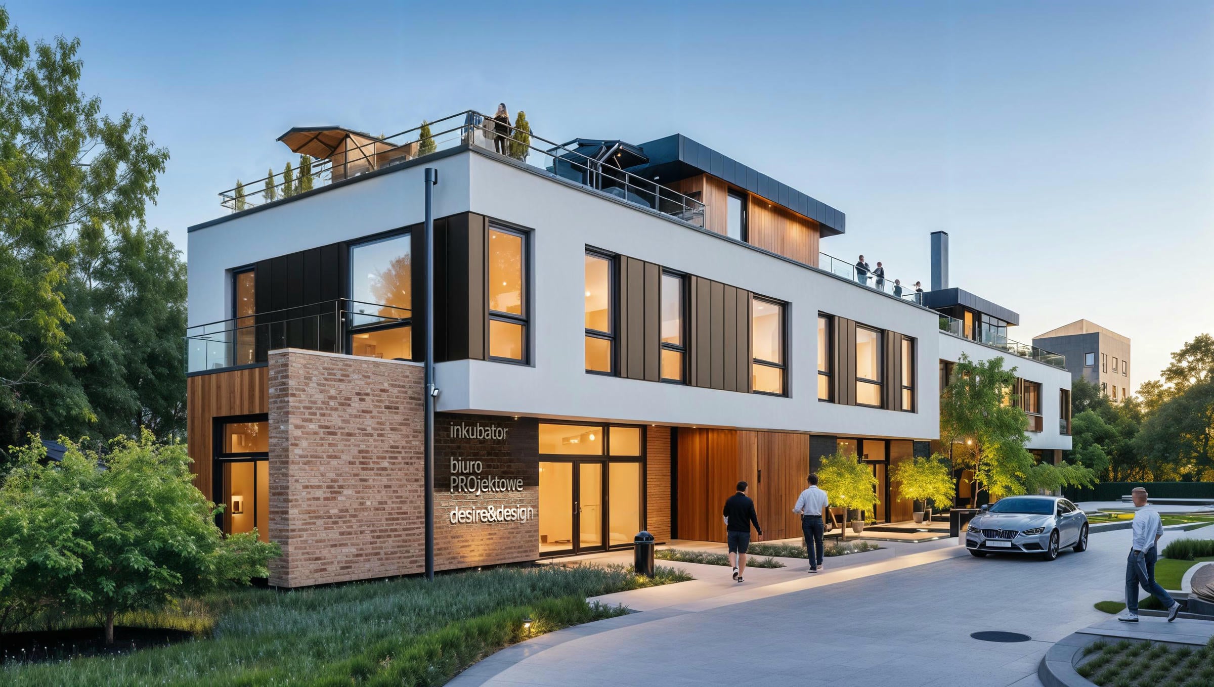 Zagospodarowanie terenu porządkuje dojazd i parkowanie – przewidziano 27 miejsc postojowych, z dostępem komunikacyjnym powiązanym z ul. Fordońską. Architektura utrzymana jest w spójnej, nowoczesnej estetyce: jasne tynki, akcenty ceglane, elementy drewniane oraz detale w odcieniach grafitu/antracytu (stolarka i obróbki).